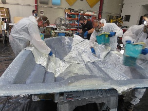 El 5º día de fabricación se continuaron los trabajos de fabricación del demostrador con el desmoldeo de la virola, así como el corte de los bordes mediante radial, evitando las zonas con sensores. Este día también se realizó la fabricación del fondo superior e inferior de tanque, ambos mediante proyección simultánea. En el día 6 los trabajos se centraron en el tratamiento de los bordes de la virola, en donde se encontraban los sensores, lo que requirió de pulir y cortar con equipamiento de pequeñas dimensiones, con el fin de evitar cortar los tubos de protección, y por tanto dañar las conexiones de los sensores. Durante el día 7 de fabricación se completó el pulido de la zona de salida de los sensores de la virola, y se ensamblo el fondo inferior. Para la realización de este ensamblado fue necesario descubrir el parabeam, tanto de la virola como de los fondos, de tal forma que se posiciona cinta de carrocero que comunica la cámara de aire de ambas partes en distintos puntos de la unión. Tras la aplicación de esta cinta, se aplicó masilla, y una vez esta estaba curada se procedió a la laminación manual de capas de refuerzo sobre estas uniones, alternando capas con refuerzo orientado, con capas sin orientación definida. Finalmente, el día 8 se procedió al ensamblado del fondo superior, siguiendo el mismo procedimiento anteriormente descrito, y se realizó el postcurado del depósito por medio de un cañón de aire caliente.