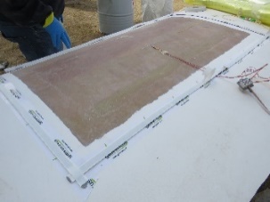En el primero de estos días se aplicó el gel-coat sobre el molde, con un tiempo de secado de varias horas, dado que de no estar suficientemente curada esta capa cuando se realiza la aplicación de la resina, se pueden producir defectos superficiales. Una vez esta capa se consideró válida para la aplicación de laminación manual de la resina catalizada, se procedió a la laminación manual de las capas de refuerzo (Figura 10). En este caso, este primer día se realizó la laminación manual de las dos primeras capas de refuerzo, junto con el correspondiente embebido de sensores entre estas. El segundo día de fabricación se realizó la aplicación de otras dos capas de refuerzo, por medio de laminación manual, nuevamente con el correspondiente embebido de sensores entre estas. En este caso, una vez se observó que se había superado el pico exotérmico de estas capas (capa 3 y 4), se procedió a la laminación de las dos últimas capas (capa 5 y 6). La laminación conjunta de cuatro capas de refuerzo implicaría una elevadísima exotermia debido a la acumulación de resina catalizada, y por tanto del calor liberado durante la reacción de curado, que podría ocasionar daños en el material y mermar las prestaciones mecánicas del componente.
