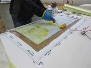 El proceso de reparación comenzó con el acondicionamiento de la superficie a reparar, tras lo cual se realizó la deposición de resina catalizada de forma manual, alternando capas de refuerzo de fibra de vidrio, con las dimensiones y orientación definidas previamente de cara a alcanzar los requerimientos mecánicos objetivo. A diferencia de procesos de laminación manual convencionales, en este proceso se realiza el embolsado de la reparación y la aplicación de vacío, que se mantiene a lo largo de todo el proceso de curado. Esto permite eliminar el excedente de resina catalizada depositada y mejorar la compactación de la fibra. En definitiva, el proceso es muy similar al de infusión, con la salvedad de que la resina se aplica previamente en una etapa de laminación manual, tal y como se observa en la Figura 4.
