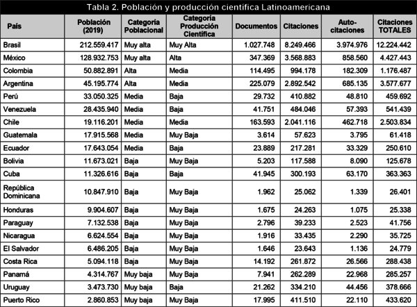 La Tabla 2 muestra la población latinoamericana para el año 2019 y su relación con la producción científica. Latinoamérica es un continente con una debilidad política, social y económica, por lo que la mayoría de los países de esta región sufren de los mismos problemas que hacen que no sea una de las regiones con mayor producción científica (Guerrero-Casado, 2017; Guerrero-Sosa et al., 2021).