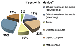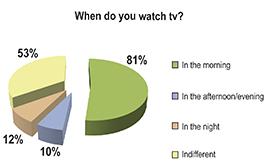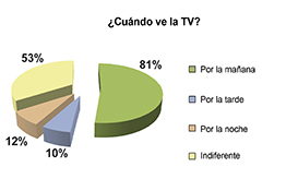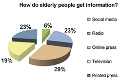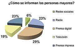 With regard to television viewing, Spaniards use the traditional platform for watching TV (85%). Amongst other possible screens for consumption they also use the desktop computer (8%) and the tablet (4%), while only 3% watch TV on their mobile phones. TV viewing in Spain mainly takes place at home and most Spanish elderly watch TV at night (55%), 25% in the mornings and 20% in the afternoon. The main media used by Spaniards to keep informed are TV (40%), newspapers (30%) and radio (20%). Only 10% claimed to keep being informed on the Internet. This result contrasts with those obtained, especially, in the United Kingdom. The elderly population in Spain uses online media much less than their British counterparts to keep informed due to their lack of confidence in online news.