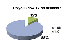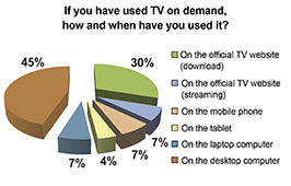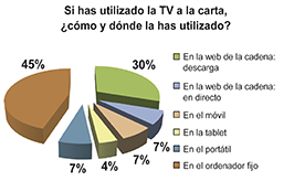 In regards to knowledge, use and consumer habits in technological devices, those surveyed in Spain between 55 and 65 years old have a high level of knowledge regarding a la carte TV or TV on demand (63%), Internet (33%), tablet (21%), WhatsApp (20%) and Facebook (19%), with concepts such as website (8%), hashtag (6%) and streaming (3%) the most unknown. There is little knowledge in Spain about the concept «a la carte TV» (12%). Those familiar with the term have sometimes used it by means of downloading audio visual content and from the TV channel’s web page. When they are told what a la carte TV is and what advantages it offers, 72% stated they would like their television set to offer them programmes in accordance with their interests and with the possibility of consuming content when they wanted.