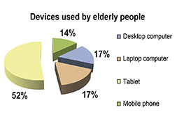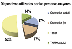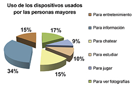 Dentro del ítem dispositivos tecnológicos (nivel de conocimiento que posee, nivel de uso y hábito de consumo), destacamos que los mayores galos tienen un alto conocimiento sobre las nuevas tecnologías y especialmente sobre las redes sociales. Todos los encuestados afirman que poseen algún tipo de dispositivo para estar conectados, siendo la tableta el más utilizado con el 52% seguido del ordenador fijo y portátil (17%). El principal uso que realizan es para estar informados (el 29%) y conectados con sus familiares compartiendo fotos y vídeos con ellos (14%). El entretenimiento es otra de las razones que destacan y justifican su uso (13%).