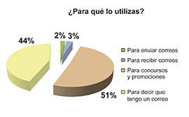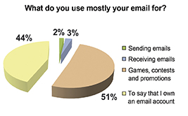 On the contrary, Spaniards are very interested in learning about new technologies (87% want training and only 13% don’t) through classroom courses (62%) and specific conferences about this subject and in accordance with their needs (38%). They demand more specifically designed education for them because they need a more basic language to understand. Training for the Spanish elderly must adapt to their profile and learning limitations/capacities. Applications are not widely used by Spanish elderly, only 15% said they had apps on their devices, amongst which were those related to the news (8%), games (5%) and online banking (2%). The use of email in Spain is quite high (63%) and their main uses are to receive mail (51%) and to send mail (44%). Only 3% said they had used it to participate in contests and promotions and only 2% claimed to use it for trends and fashion.