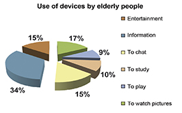 Finally, the results in relation to usability and navigation on the Internet and purchasing habits are of interest. Most of the French elderly who were surveyed purchase directly on websites (45%); while 32% state that before buying they look for information on the Internet prior to going to the sales site. These data reflect the lifestyle of older people in France and their adaptation to new technologies, especially in regards to the changes in purchasing habits. The Internet links them to the world outside; it is a medium that provides them with an open window to the world and a way of keeping in touch with the French society. In France the ICT knowledge level is very high amongst younger generations, but as we can observe, it is also quite high in the elderly population. Their most common purchases online are transport tickets (train, bus and aeroplane) and food products they purchase weekly on their tablets.