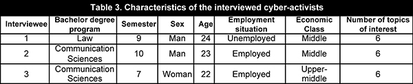 In a second stage, when examining the in-depth interviews conducted with three of these students (two men and a woman) the fact that they are studying and working stands out, besides from actively participating in online social networks. Their studies are under the social sciences umbrella and are senior undergraduate students (table 3).