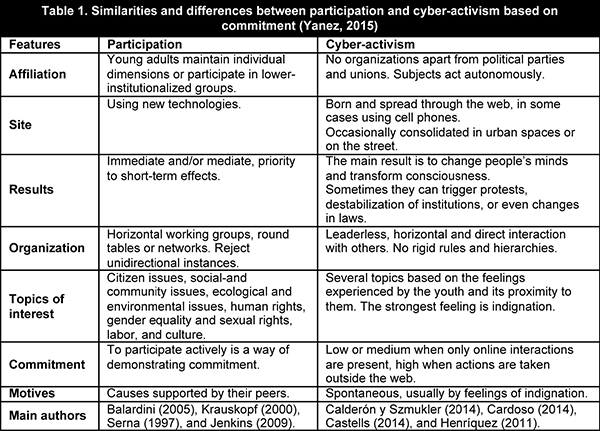 Por su parte, Henríquez (2011) menciona que los cambios en la forma de comunicación y de organización permiten nuevas formas de participación social. Una de estas formas es el ciberactivismo en el cual los jóvenes usan la tecnología, en especial Internet, para organizar actividades, discutir, compartir información, participar y expresar su descontento sobre temas con los que se identifican. De-Ugarte (2007) agrega que el ciberactivismo es toda forma de participación social que se da por medio del uso de las TIC, distinguiéndose porque persigue cambiar la situación actual a través de la movilización y la militancia. Este concepto de ciberactivismo ha recibido varios nombres, desde clic-activismo, activismo en línea, e-activismo, activismo digital, activismo virtual, activismo mediante el uso de redes, hasta movimientos sociales digitales. Pero, al igual que la participación, se organiza de manera horizontal alrededor de temas novedosos, buscando resultados como cambios de mentalidad. En la tabla 1 se presentan las similitudes y diferencias entre participación y ciberactivismo, y cómo se percibe el compromiso en ambos a partir de la revisión de los principales autores que han investigado estos temas.