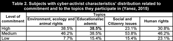 By matching the four topics identified as theoretically related to cyber-activism with the level of commitment, it was found that there is a higher percentage of medium to high, as shown in table 2.