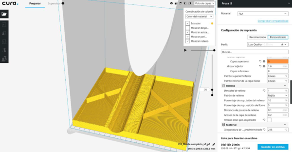 El tiempo total de fabricación correspondiente a la impresión 3D se recoge fue de 14 días, 5 horas y 24 minutos, con un peso total de plástico de 6.871 g.