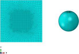 En la placa se realizó una partición cuadrada de 60 mm2 que concentra el área central de mayor interés donde se produce en impacto. Esta partición ayuda a realizar un mallado más fino en la zona de interés en comparación al mallado fuera de esta región, ayudando a su vez a disminuir el coste computacional de la simulación y manteniendo la precisión de los resultados. Para mallar la estructura se utilizaron elementos cuadrilaterales tipo placa (del tipo S4R en Abaqus/Explicit), con integración reducida y un mallado de técnica libre, obteniendo 42693 elementos, como se muestra en la Figura 1 (izquierda). Para el mallado del proyectil, se utilizaron 3003 elementos rígidos cuadrilaterales, del tipo R3D4 en Abaqus/Explicit, como se muestra en la Figura 1 (derecha).