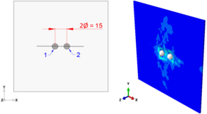Para las pruebas numéricas de impacto múltiple simultáneo se utilizan dos proyectiles de iguales características, que se encuentran separados a la misma distancia de la placa (pegados a la estructura por motivos de coste computacional) y que impactan a la misma velocidad, pero en distintos lugares de la placa. La Figura 4 muestra las características de la evaluación del fenómeno de impacto múltiple simultáneo. Se considera una separación entre proyectiles equivalente a dos veces el diámetro del mismo, es decir 15 mm. Con esto se busca garantizar la existencia de interacción entre las ondas de tensión, generadas por la acción de cada proyectil.