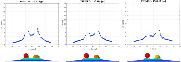 Para analizar los desplazamientos fuera del plano se ha tomado como referencia la velocidad de impacto de ambos proyectiles de 132 m/s. Esto puesto que a esta velocidad se produce la perforación anticipada del proyectil 1, ubicado a la izquierda (velocidad residual de 80,9 m/s), con respecto al proyectil 2, ubicado a la derecha (velocidad residual de 43 m/s), teniendo una diferencia entre sus velocidades residuales de 37,9 m/s. En la Figura 5 se muestra el momento en el que los proyectiles perforan la placa, y cómo se genera la interacción de los desplazamientos fuera del plano.