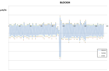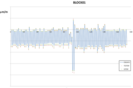 El espectro del ensayo, que ha sido generado por Airbus, es una simplificación del espectro analìtico, validado mediante los niveles de microdeformaciones de los puntos de control y las cargas límite asociadas a los mismos.