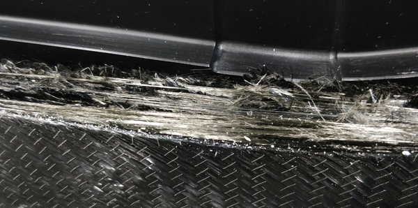 Un avance demasiado lento permite a las fibras deslizar y evitar la cuchilla además de crear un agolpamiento de hilos en el filo que dificultan el avance del corte (Figura 5). Es posible que esto se vea amplificado con calentamiento local que funde el binder y facilita la separación entre capas.