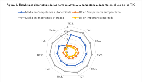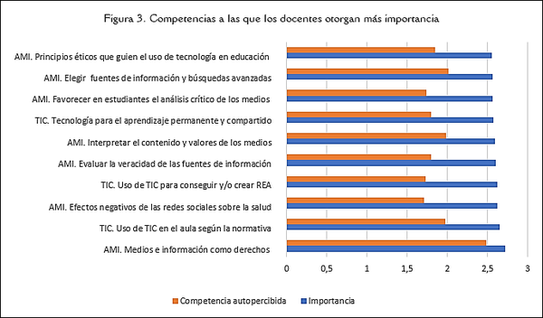 El análisis de la importancia otorgada a cada uno de los ítems revela que los valores medios son mayores que su respectiva autopercepción de competencia. La capacidad de utilizar las TIC en el aula adecuadamente es la competencia más valorada, seguida de la utilización de las TIC para conseguir y/o crear recursos educativos abiertos (REA), aspecto este último en el que no se consideran tan competentes como en el anterior. Los dos aspectos menos valorados coinciden con los dos en los que los participantes se consideran menos competentes: el uso de la tecnología para la gestión escolar, y la capacidad de analizar el fenómeno del «big data».