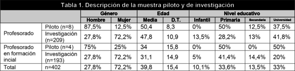 En cuanto a la selección de los participantes para el estudio piloto (n=12) se llevó a cabo un muestreo no aleatorio por conveniencia, ya que se envió a docentes y futuros docentes de diversas etapas educativas, puesto que eran la población objeto de estudio. En cuanto a la etapa educativa en la que imparten docencia, un 50% son de Primaria, un 10% Secundaria y un 40% Estudios Universitarios. Para la selección de los participantes en la investigación (n=401) se utilizó un muestreo no aleatorio por bola de nieve, ya que se pedía a los docentes que contestaban el cuestionario que compartieran el enlace con otros docentes que conocieran. Se decidió usar este tipo de muestreo ante la imposibilidad de acudir a los centros educativos por las restricciones derivadas de la COVID-19. En la Tabla 1 se presenta una descripción de ambas muestras, la piloto y la del estudio.