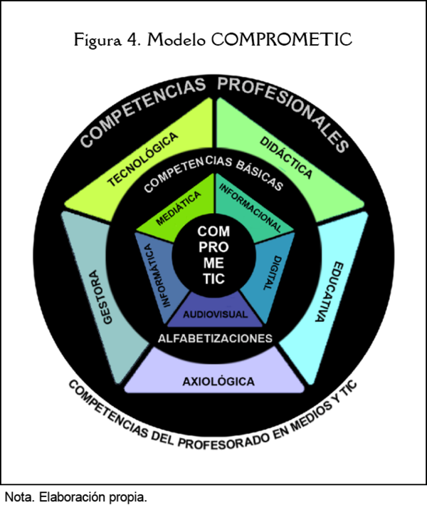 En un primer paso convergente, la Unesco ya propuso el término AMI para integrar la alfabetización mediática e informacional (Wilson et al., 2011) y posteriormente se propone la convergencia de AMI con la alfabetización digital en lo que Frau-Meigs (2015) denomina «Augmented MIL» (o AMI aumentada). La tendencia integradora continúa con el término MILX (Media and Information Literacy Expansion) para integrar la AMI con otras competencias sociales (Grizzle & Hamada, 2019). También Unicef (Nascimbeni & Vosloo, 2019) propone un enfoque global de la alfabetización digital que la acercaría al resto de alfabetizaciones básicas sobre TIC y medios. Se avanza en esta línea con el modelo COMPROMETIC (competencias del profesorado en medios y TIC) (Figura 4), basado en una doble convergencia: