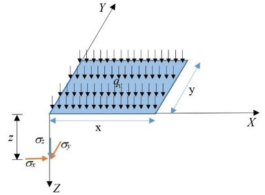 Vertical normal stresses in an infinite ground mass generated by the action of a uniform horizontal distributed load () on a rectangular area (Figure 13) can be calculated under a corner (of loaded surface) to z depth using the following expressions [31]: