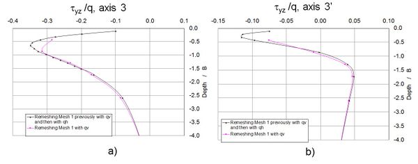 Figure 16 shows the normalized shear stresses yz along axes 3 and 3´. It is seen that the remeshing considering the present loading conditions has a significant effect from the ground surface down to a depth equal to the foundation width. Therefore, the results obtained in this paper seem to indicate that whenever the elements of the initial mesh are not modified as a function of the ongoing load conditions, the results could lead to biased conclusions regarding the problem under consideration. Hence, meshes defined for particular problem conditions are not generally suited for the same problem whenever the load boundary conditions are modified.
