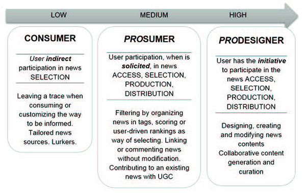 Nuestro marco conceptual en tres niveles sugiere que la participación en los procesos de consumo y producción de noticias puede darse de muchas formas diferentes. Dependiendo de la participación del usuario y su contribución, esta puede ser no planificada, solicitada u orientada por el usuario (figura 1).