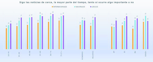 Los usuarios más jóvenes (18-34 años) consumen menos noticias que los usuarios de más edad, con solo un 49% de consumo de noticias internacionales, en comparación con el 67% de los usuarios de más de 75 años, quienes consumen más noticias internacionales. Si nos fijamos en el consumo de noticias en relación con el género, tanto hombres como mujeres consumen mucho menos noticias internacionales (57% y 56%, respectivamente); cuando comparamos las noticias locales y las mujeres, ellas consumen más noticias locales (75%) que los hombres (67%) con datos similares en ambos géneros ante las noticias internacionales. En general, en relación con el género, las mujeres consumen más noticias que los hombres, a pesar de que un buen número de mujeres y hombres todavía siguen ampliamente las noticias.