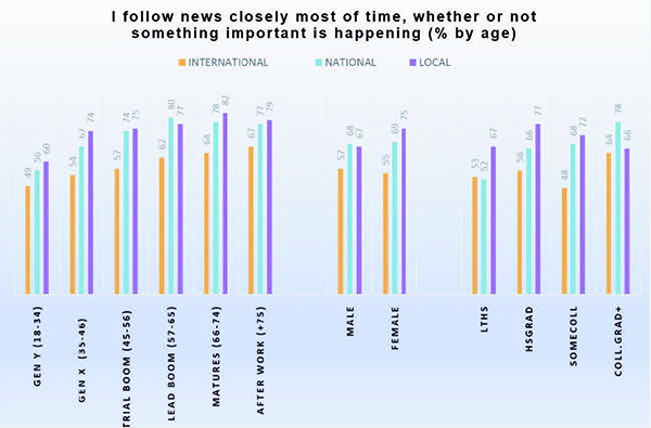 The results showed significant differences in the ways the audience engages with the news. Figure 2 illustrates the news consumption (news following) patterns of the audience studied based on age, gender and education. The table shows that the Matures (66-74 yr. old) consume the most news with 82% of them consuming local news closely followed by the Lead Boomers (57-65 yr. old) with 80% consuming national news.
