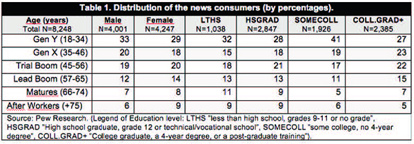 Using this Pew database, we explored patterns of users’ news consumption and production by examining the influence of variables such as: age (by six conglomerates of generational age breaks), gender and education level (by four groups of grade completed) as described in table 1. The analysis we conducted consisted of basic descriptive statistics and cross-tabulations.