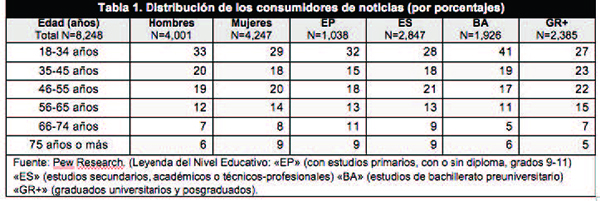 Usando los datos de la base de datos de Pew, exploramos los patrones de consumo y producción de noticias de los usuarios mediante el examen de la influencia de tres variables: edad (por seis conglomerados, de saltos generacionales de edad), sexo y nivel de estudios (por cuatro grupos, según el nivel completado) como se describe en la tabla 1. El análisis que desarrollamos se obtuvo a partir de estadísticos descriptivos y tabulaciones cruzadas.