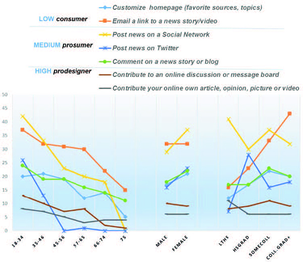 From seven items of the survey we extrapolated data to illustrate low to high levels of interaction and participation with the news. Drawing on three categories of age, gender and education, we explored participatory practices such as customising a home page in order to contribute your own online article, opinion, picture or video. The section of “social media sources” in Figure 3 reveals that Gen Y (18-34 yr. old) are the highest consumers and pro-designers but are not as high as Gen X (35-46 yr. old) in posting a news item to Twitter. Overall Gen Y are the highest news producers and designers and 65+ are the least, they are the group with the lowest rate to be a consumer, producer or pro-designer. No one over 50 yr. old tweeted about the news.