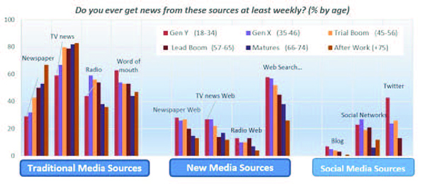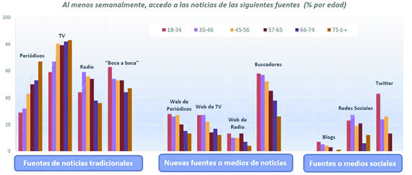 Todos los grupos de edad indicaron que su principal fuente son las noticias televisivas. En los usuarios de 18-34 años se observa una cantidad significativa de noticias conocidas informalmente, a través del boca a boca (63%), mientras que los usuarios de más de 75 años prefieren claramente los periódicos en papel, como fuente de información frecuente. El hallazgo más interesante en relación con los nuevos medios es la comparación de las fuentes de noticias en la web de los usuarios más jóvenes (18-34 años) liderando el consumo basado en las búsquedas de noticias en la web, frente a cualquier otro grupo de edad. El uso más bajo en la búsqueda a través de fuentes de la web, con solamente el 30%, se detecta entre los usuarios de mayor edad.