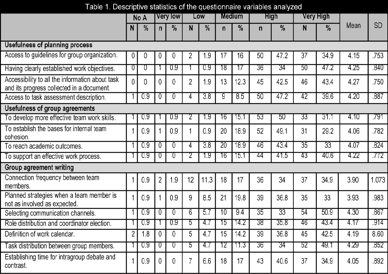 In order to guarantee validity, the first version of the questionnaire went through a subject-matter expert content validation and was subjected to a pilot study. As for reliability, Cronbach’s alpha intern reliability index was used in all the three categories within the section. The coefficients obtained were a=0.859 for «Usefulness regarding the planning process», a=0.894 for «Usefulness of group agreements» and a=0.867 for «Group agreement writing».