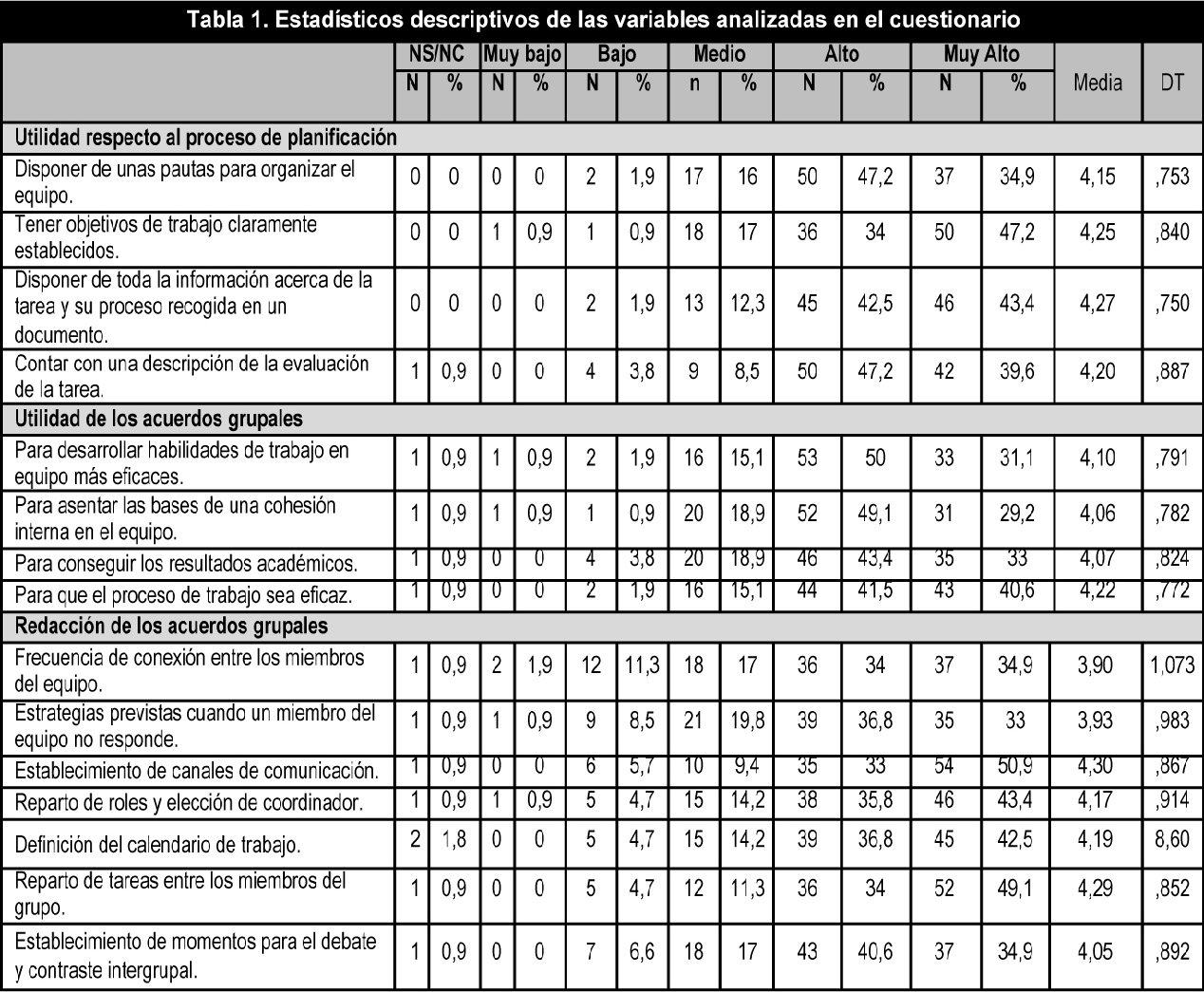 In order to pursue the exploratory and descriptive intentionality of the study, the methodology selected was non-experimental and quantitative, in the form of a survey (Buendía, Colás & Hernández, 1997; Cohen & Manion, 1990; McMillan & Schumacher, 2005). A Likert scale questionnaire was designed for the purpose of data collection with a five-answer level scale. The results appear in Section II under the titlen «Organi zation and management of team work prior to task performance». This section includes three categories that appear in Table 1: «Usefulness regarding the planning process» (including 4 items); Usefulness of group agreements» (4 items) and «Group agreement writing» (7 items). The questionnaire was answered in a face-to-face class just before the end of the course. A non-probabilistic, accidental or convenience sampling technique was used (Cohen & Manion, 1990; McMillan & Schumacher, 2005) to count the informants according to their availability or accessibility. Statistical analyses were undertaken with the SPSS 19 program.