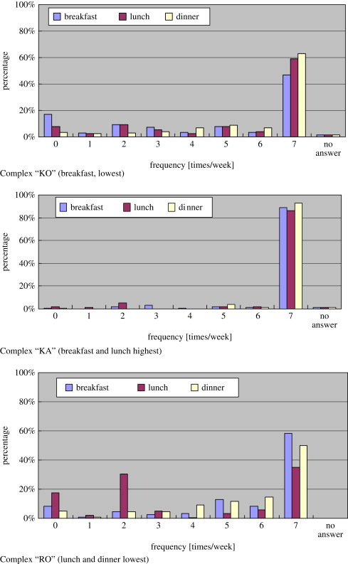 The percentage of families cooking dinner seven days a week is 74% on the average, the minimum being 50% (complex “RO”), and the maximum 93% (complex “KA”). Compared with breakfast and lunch, the percentage of families that cook dinner is high. The percentage of families that cook dinner is lowest in the complex “RO”, perhaps because most of the families in this complex were young, dual-income couples.