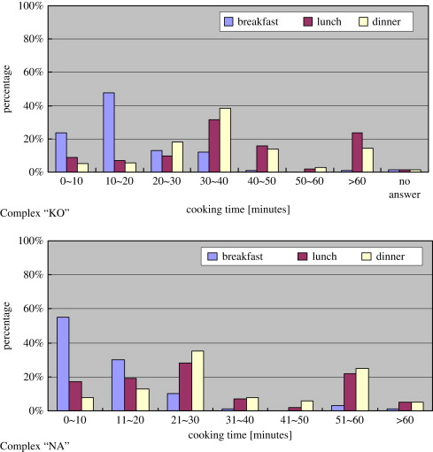 The cooking time for breakfast was 0–10 min or 10–20 min for most families, whereas the cooking time for lunch or dinner formed two peaks at 20–30 min or 50–60 min. These times were longer by 10 min in other complexes. The cooking time for dinner tended to become longer. These figures indicate that a large amount of energy consumption for cooking may result from a longer cooking time for lunch and dinner.