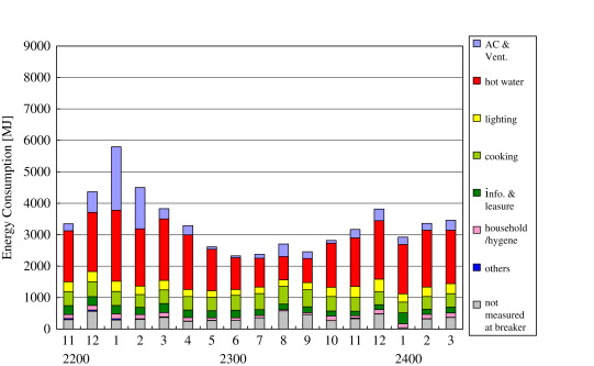 Figure 14 presents the annual fluctuations in energy consumption in western Japan (Kinki district) (AIJ, 2006 ). The energy consumption for hot water increases in winter and it is closely related to the increase in the frequency of taking baths.