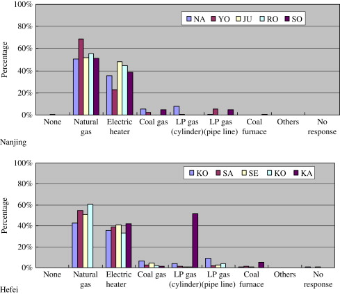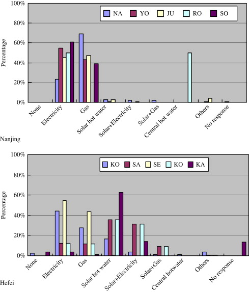 In contrast, hot water systems powered by electricity, gas, solar energy, and a combination of solar energy and electricity were used in almost the same ratios in Hefei. Up to approximately 60% of the families had introduced solar systems, even though most of the surveyed condominiums were higher than ten stories.