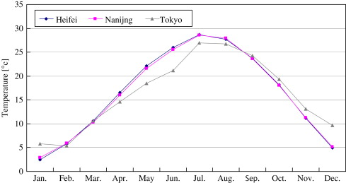 Figure 1. Monthly average of outdoor temperatures in Nanjing, Hefei, and Tokyo. |