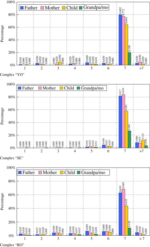 Figure 4 shows the frequency of taking showers during a week in three complexes, “YO”, “SE”, and “RO”. The color codes on the bars are for male host (blue, called “father” hereafter), female host (pink, mother), child (yellow), and the rest (green, grandfather/mother). In complexes “YO” and “SE”, 85% of both fathers and mothers took a shower seven times a week (every day) or more. Children took showers less frequently; only 20 to 30% of grandparents took showers.