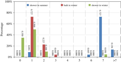 In summer, the frequency of taking showers was much greater than that of taking baths, and the families who took baths once a week was no more than 10%. In contrast, the frequency of showers in winter drastically decreased to 1–3 times a week, while the taking of baths increased.