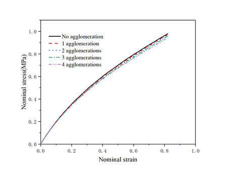 Particles in the matrix are usually distributed unevenly, there will be agglomeration, the literature for the agglomeration of less involved, so this paper with the help of DIGIMAT software, the establishment of the RVE model containing carbon black agglomerates, agglomerates are established as in Figure 13. The formation of agglomerates formed by a number of carbon black particles is idealized as a larger carbon black particles, the establishment of the degree of particle clustering was 1 at the aggregation, 2 at the aggregation, 3 at the aggregation, 4 at the aggregation model for numerical simulation calculations, to more accurately respond to the trend of the stress-strain curve changes after the generation of agglomeration. The establishment of carbon black particles volume fraction of 13.34% and 19.47% of the two kinds of uniaxial tensile nominal stress-nominal strain curve of the composite material and the Mise stress cloud diagram shown in Figures 14 and 15 were obtained.