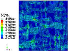 For the numerical model with 13.34% volume content of carbon black, uniaxial stretching was realized by applying 1 μm displacement along the x-axis, and the deformation map and stress field of the RVE model were calculated with the help of ABAQUS software, and the deformation map and stress field of the RVE with a volume fraction of 13.34% are shown in Figures 8 and 9, respectively.