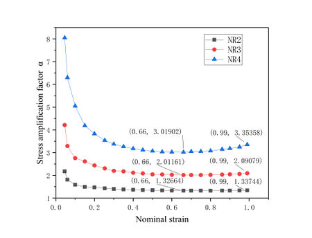 | Figure 2. The stress amplification coefficient of different filled rubber changes to the nominal strain |