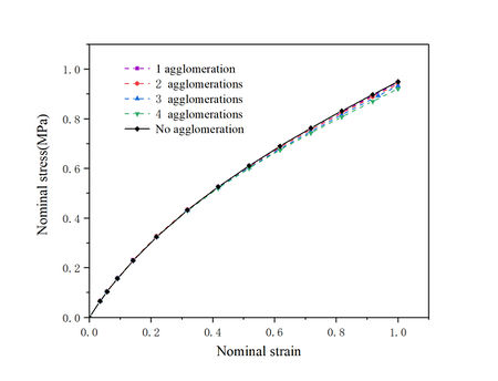 As can be seen in Figures 14 and 15, the combined strength of the composites decreases slightly as agglomeration occurs, when only one agglomeration point exists, the stress-strain relationship is approximate to the non-agglomeration case, however, as the degree of agglomeration increases, the overall stress level of the composite decreases. This is due to the fact that more agglomeration leads to load transfer from regions with fewer particles to the agglomerated regions, even under small strain conditions, defects may appear in the agglomerated regions due to stress concentration.
