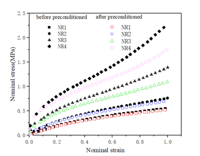In this paper, the rubber specimens were firstly modulated before doing the uniaxial tensile experimental process, so as to eliminate the influence of Mullins effect on the mechanical behavior of rubber, and to obtain more stable experimental data. Each specimen was subjected to 6 repeated unidirectional tensile loading and unloading at a strain rate of 0.06 /s, with a cyclic strain of 150%, and the modulated specimens were placed at room temperature for 24 hours before uniaxial tensile testing.