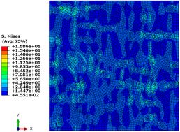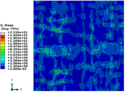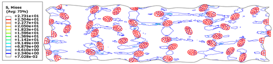 Mises stress cloud map in Figures 16 and 17 show similar results for both volume fraction RVE models. The stress concentration becomes more pronounced as the agglomeration increases, this can be attributed to the idealization of agglomerates, i.e., larger carbon black particles with a larger contact area with the matrix.