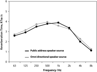 Fig. 8. Comparison of the RT60 between the public address speaker sound source and the omni-directional speaker sound source. |