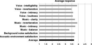 The survey for the evaluation consisted of ten questions in total: four questions for voice recognition - speech intelligibility, reverberation, intimacy, and loudness; four questions for music recognition - clarity, reverberation, intimacy, and balance between low and high sound in music; and two questions for overall satisfaction - satisfaction about background noise and satisfaction about sound.