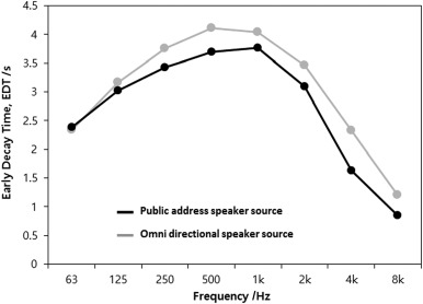Fig. 7. Comparison of the EDT between the public address speaker sound source and the omni-directional speaker sound source. |