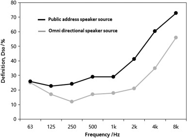 Fig. 10 shows measurement results (the average value of 11 measurement points) of the D50 . Measured D50 with regard to the omni-directional speaker sound source was 18% on average at 1 kHz. Similar to the result for C80 , all points, except R1 and R2 around the altar, which were close to the sound source, showed significantly lower values than appropriate values such as 30–40% for concert halls and 55–60% for multi-purpose halls (Barron, 2010 ). Meanwhile, measured D50 with regard to the public address speaker sound source was 29% on average at 1 kHz, and the result showed better definition overall compared to that of the omni-directional speaker sound source. In particular, more than 30% of definition was shown in the frequency band over 500 Hz, which met the definition of the appropriate value of 30–40% for concert halls and 55–60% for multi-purpose halls.