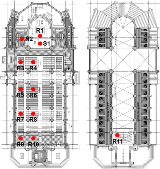 The measurement points were divided into three sections: altar area (R1, R2), cathedral nave and side aisles (R3–R10), and choir in the upper floor (R11). The height of the measurement point was set to 1.2 m, and an omni-directional measurement microphone was used. Fig. 3 shows sound source and measurement points and Fig. 4 shows installed column speaker points.